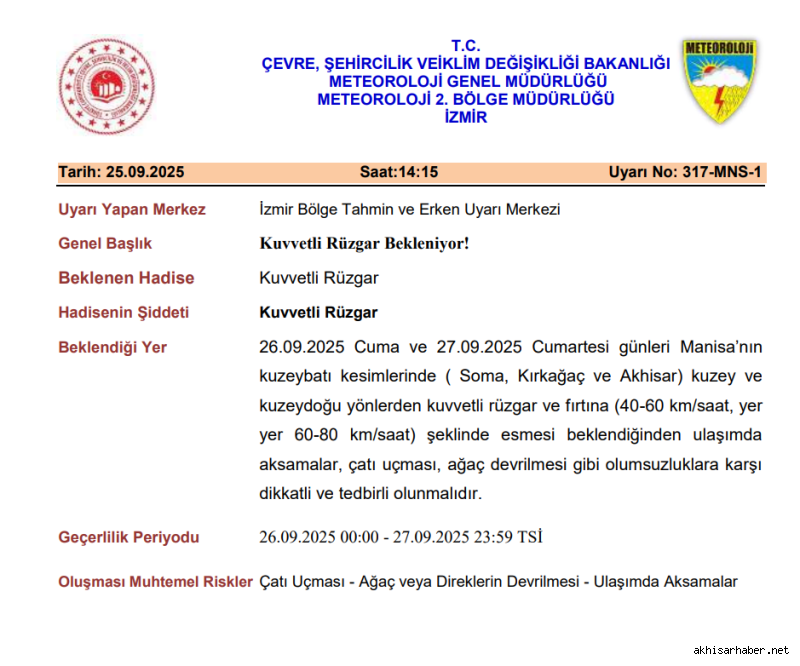 26 Eylül Cuma ve 27 Eylül Cumartesi günleri Soma, Kırkağaç ve Akhisar çevresinde, kuzey ve kuzeydoğu yönlerden saatte 40-60 kilometre hızla, yer yer ise 60-80 kilometre hızla esmesi beklenen rüzgârların, ulaşımda aksamalara, çatı uçmalarına, ağaç ve direk devrilmelerine yol açabileceği bildirildi.