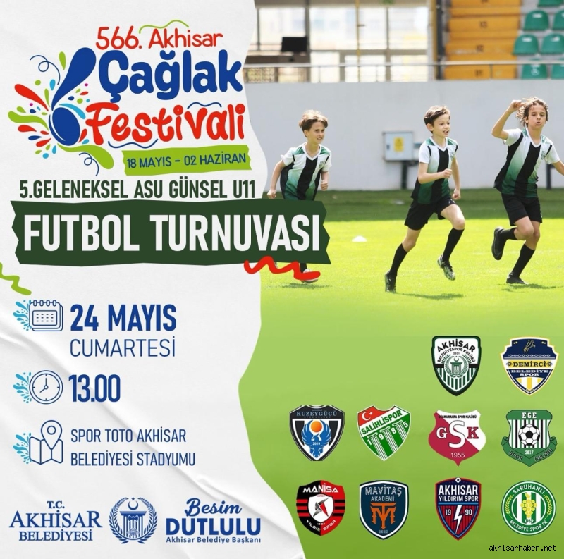 Akhisar Belediyesi’nin ev sahipliğinde düzenlenen 566. Çağlak Festivali, sporun coşkusunu çocuklarla buluşturuyor. Festival kapsamında bu yıl 5’incisi gerçekleştirilecek olan Geleneksel Asu Günsel U11 Futbol Turnuvası, 24 Mayıs Cumartesi günü saat 13.00’te Spor Toto Akhisar Belediyesi Stadyumu’nda başlayacak.