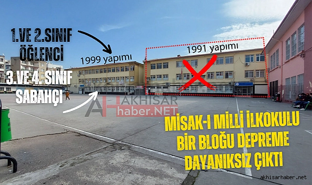 Akhisar’ın en eski okulları arasında yer alan Misak-ı Milli İlkokulu’nda yakında zamanda yapılan test sonuçlarına göre bir bloğunun depreme dayanıksız olduğu ve boşaltılacağı bildirildi.