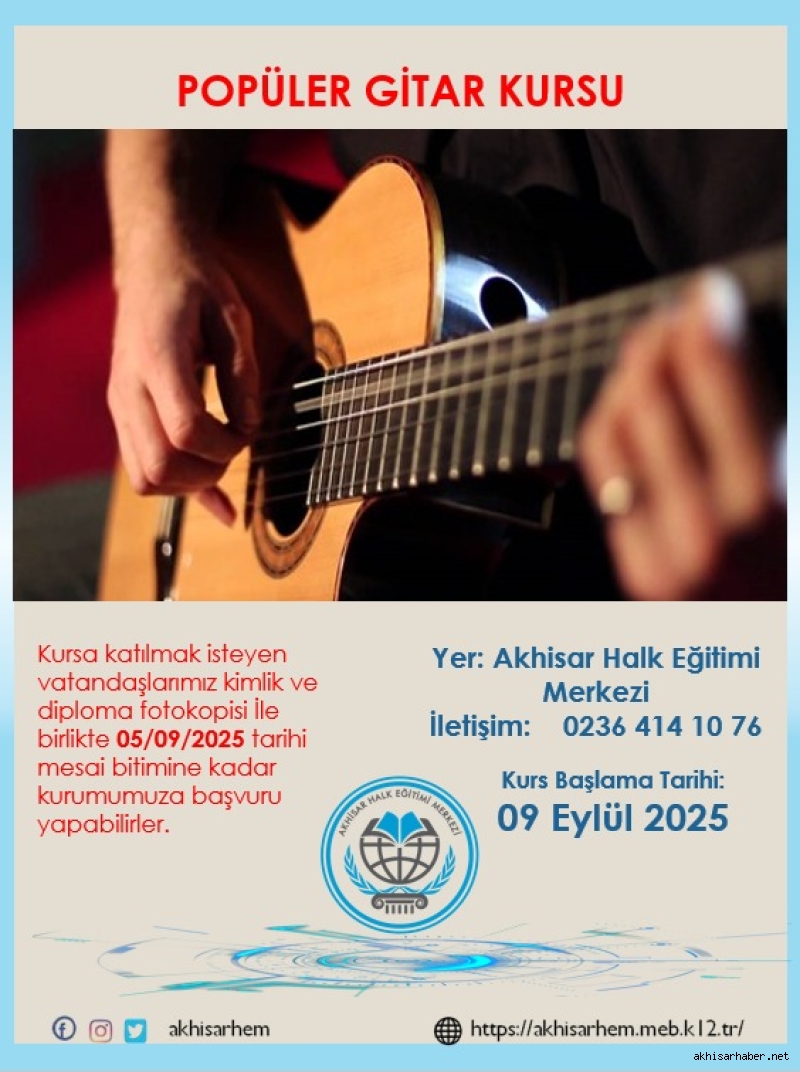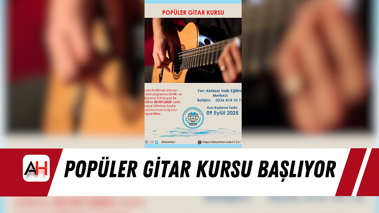 Akhisar Halk Eğitim Merkezi, müzikseverler için yeni bir kurs açıyor. Popüler Gitar Kursu, 9 Eylül 2025 tarihinde başlayacak.