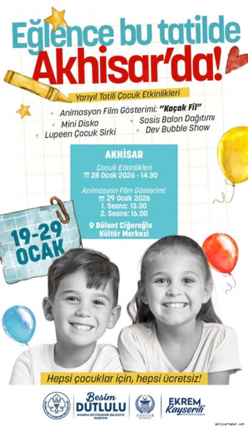 Manisa Büyükşehir Belediyesi ve Akhisar Belediyesi iş birliğiyle düzenlenen yarıyıl tatili çocuk etkinlikleri, animasyon film gösterimlerinden mini diskoya kadar dopdolu bir programla Akhisar’da çocuklarla buluşuyor.
